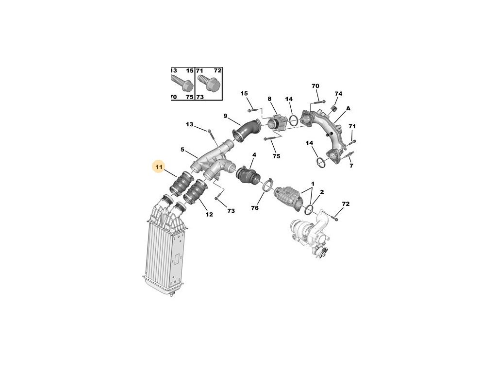 Hadice přeplňování vzduchu z mezichladiče do sání pro motory Citroën Peugeot 1.6 HDi, DV6D, ve vozech Citroën C3 druhé a třetí generace, C3 Picasso, C3 Aircross, C4 Cactus, DS3, C-Elysee a C4 Aircross.